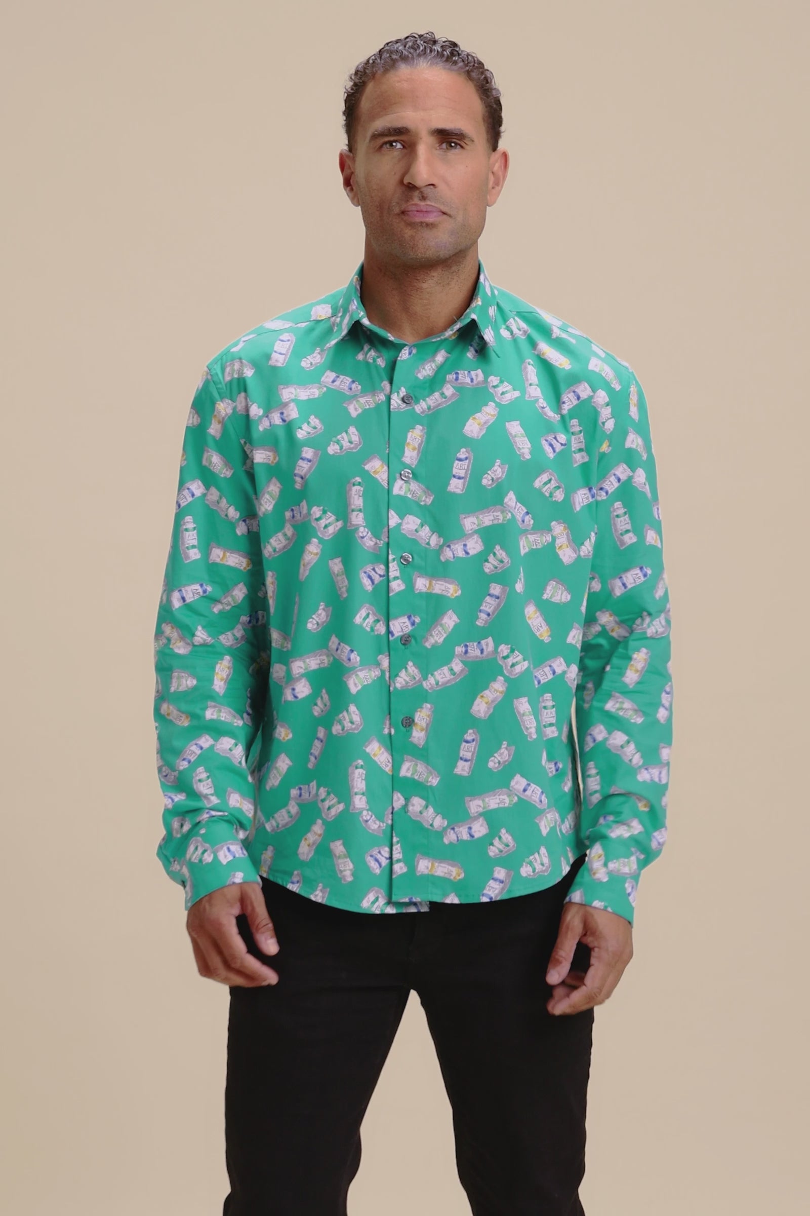A bold graphic shirt cut from saturated teal Japanese cotton, printed with illustrated painter's paint tubes at a confident scale. Clean, modern, and designed to stand on its own.