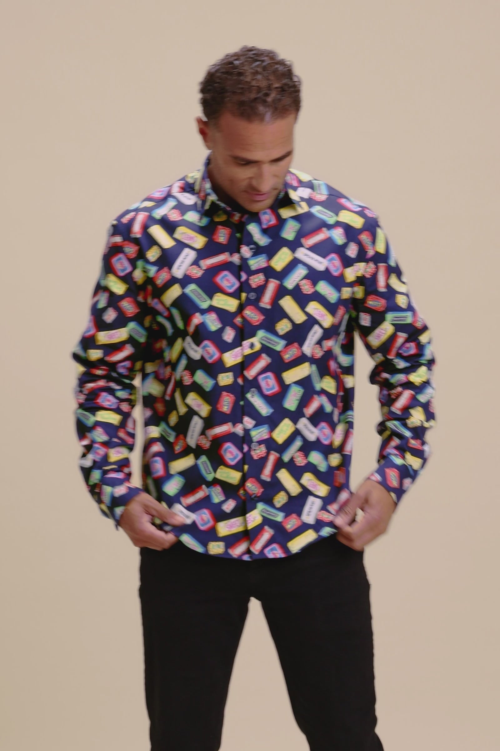 A graphic statement shirt featuring vintage spearmint and chewing-gum packaging printed on a deep navy ground. Bold in design, precise in execution.